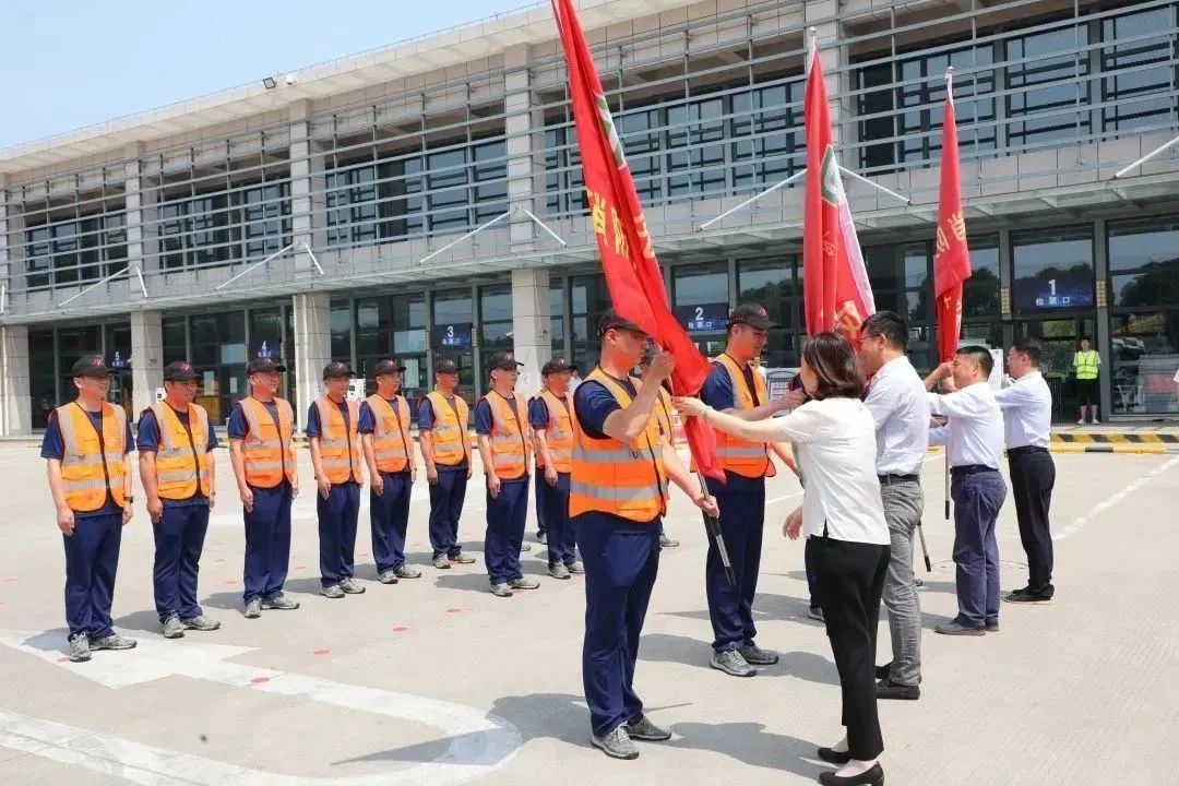 在演练前举行了青浦巴士公交退役军人消防分队成立仪式,参加活动的领导们为退役军人消防分队授旗。
