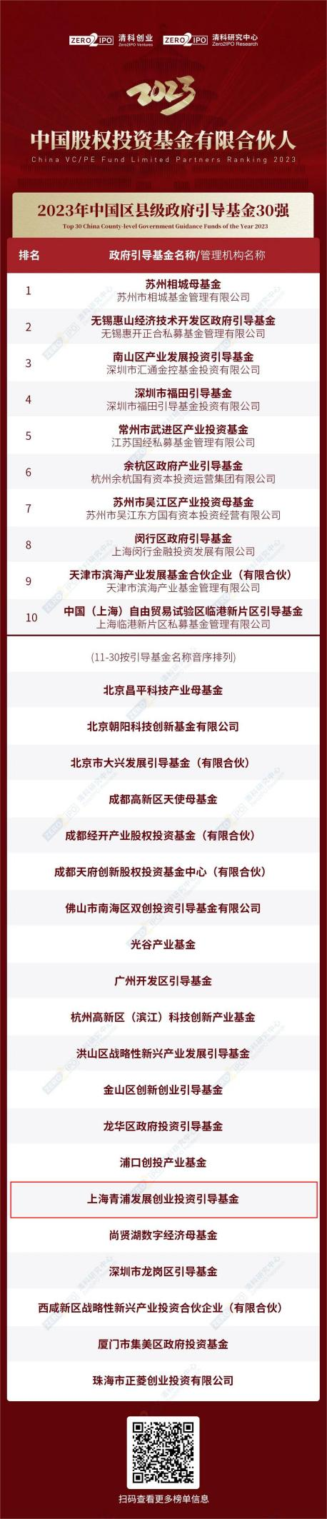 喜报!青发创投基金荣获清科榜单“2023年中国区县级政府引导基金30强” 2023/07/24