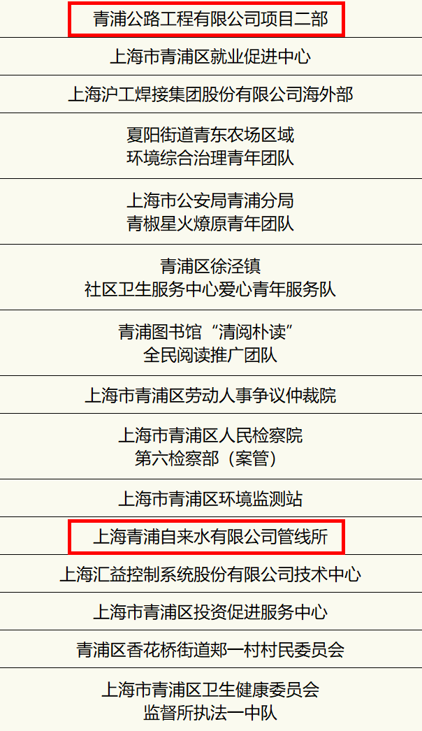 近日,团市委正式发布了《关于命名第25届上海市青年文明号及认定一星级上海市青年文明号的通知》和《关于表扬2022年度上海市基层团组织典型集体和个人的决定》,经基层推荐、互学互访、综合比选、社会公示等环节,青浦区15个集体被认定为“一星级上海市青年文明号”。其中,青发集团下属上海青发市政管理有限公司项目管理部(原青浦公路工程有限公司项目二部)、上海青浦自来水有限公司管线所荣获一星级上海市青年文明号。