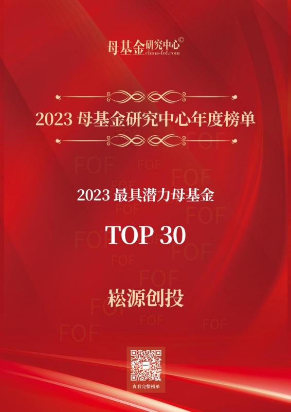 2023年12月9日至10日,“2023中国母基金50人论坛”在北京举行,并正式发布母基金研究中心2023年度榜单。崧源创投荣获“2023最具潜力母基金TOP30”。