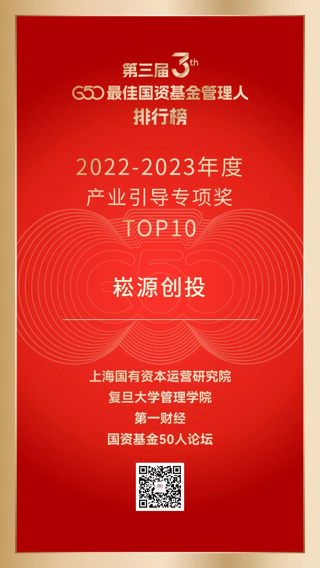 11月19日,第三届最佳国资基金管理人颁奖典礼暨2024国资基金(湖北)高峰论坛在湖北省武汉市盛大举行。由上海国资院、G50联合复旦大学管理学院共同推出的第三届G50最佳国资基金管理人榜单正式揭晓,崧源创投荣获2022-2023年度产业引导专项奖TOP10荣誉。