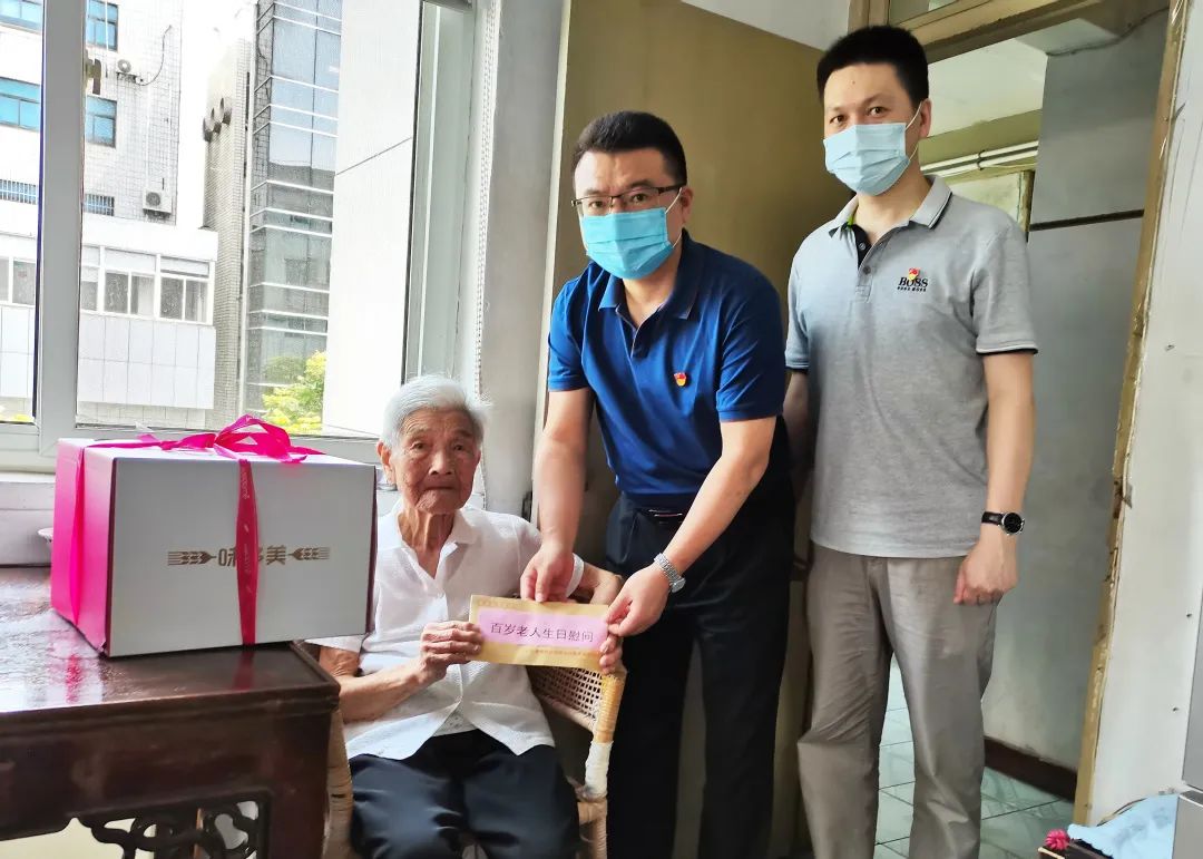 7月12日,房产置业党支部开展慰问百岁老人活动,支部书记江华、副总经理顾利峰一行走访慰问了本区百岁老人卓林如,并为老人送去了生日蛋糕和慰问金。