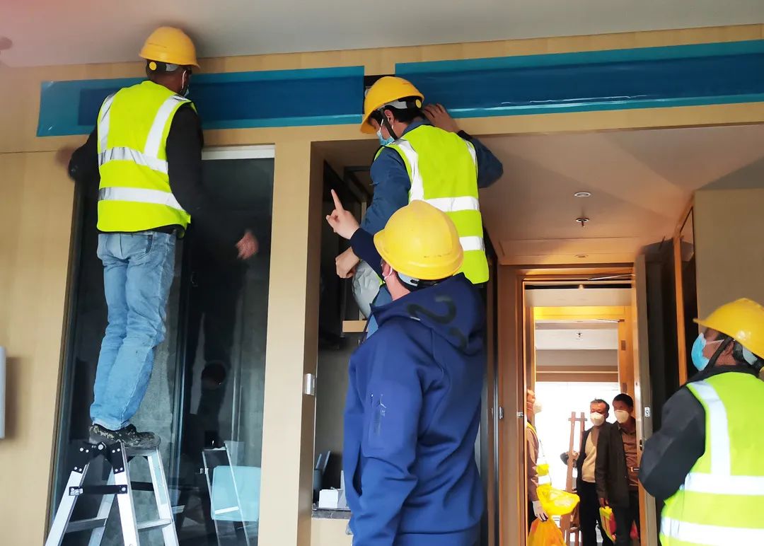 接到这项重要任务通知是在30日晚上11点,青发集团片刻不敢耽误,内部迅速讨论后,“突击队”负责人立刻动身,于31日凌晨2点到达相关酒店进行现场踏勘,并讨论确认了施工方案。