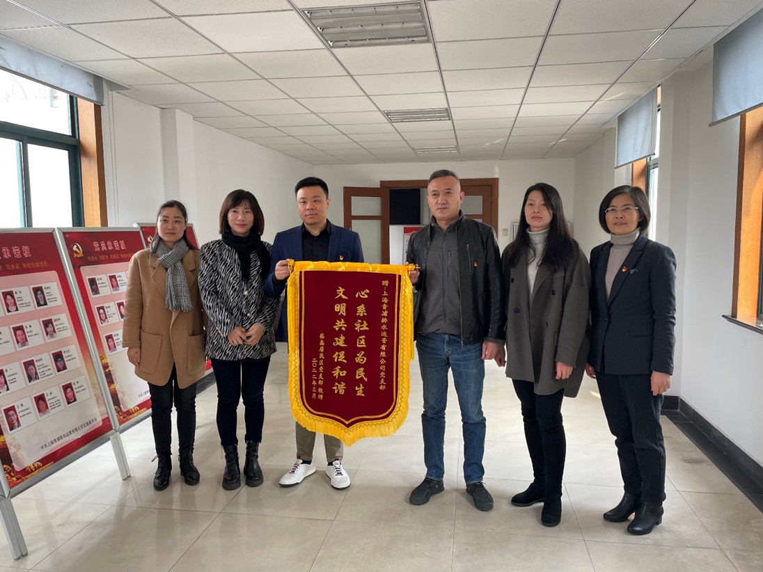 赵巷镇崧鑫社区党总支书记夏俊峰一行来青浦排水运营有限公司,将绣有“心系社区为民生 文明共建促和谐”的锦旗送到党支部书记夏脉律手中,以感谢公司党支部对社区工作的支持和帮助。