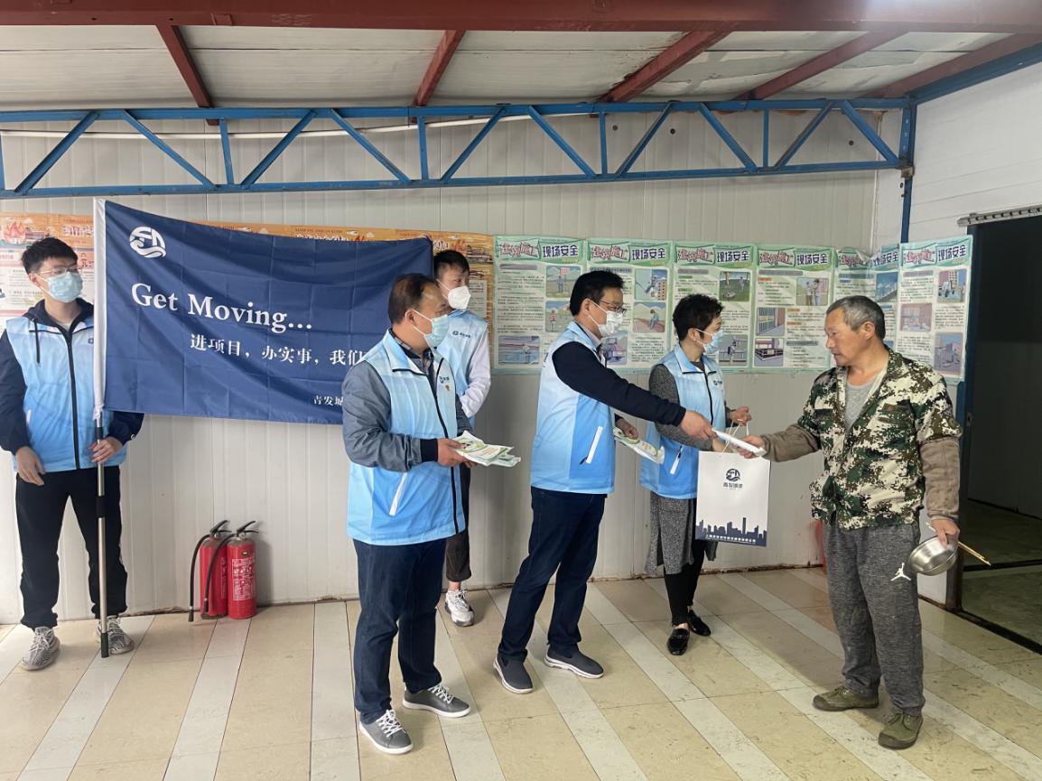 青发城建党支部成立“Get Moving…”志愿服务队,深入崧泽二标项目部,张贴疫苗接种海报,发放疫苗接种宣传册及防疫口罩。