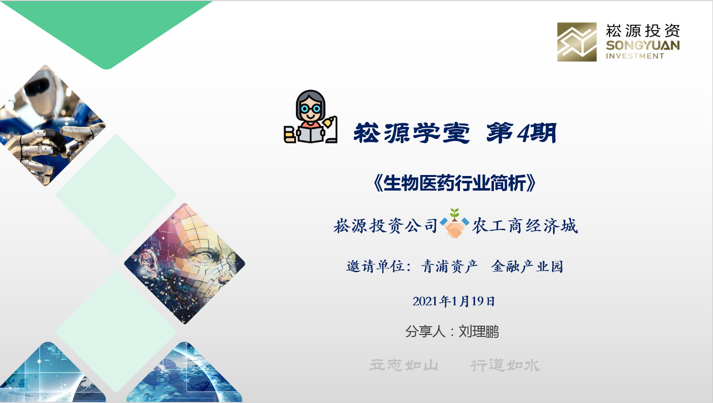1月19日,青发集团下属青发投资联同农工商经济城开展崧源学堂第4期——《生物医药行业简析》。集团党委委员、副总经理邓大虹参会,并邀请资产公司与金融产业园共同参加。