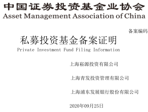 2020年9月25日,中国证券投资基金业协会出具私募投资基金备案证明,由上海青发投资管理有限公司作为管理人,上海浦东发展银行股份有限公司作为托管人的“上海崧源投资有限公司”(青发创投基金二期)在中国证券投资基金业协会成功备案!