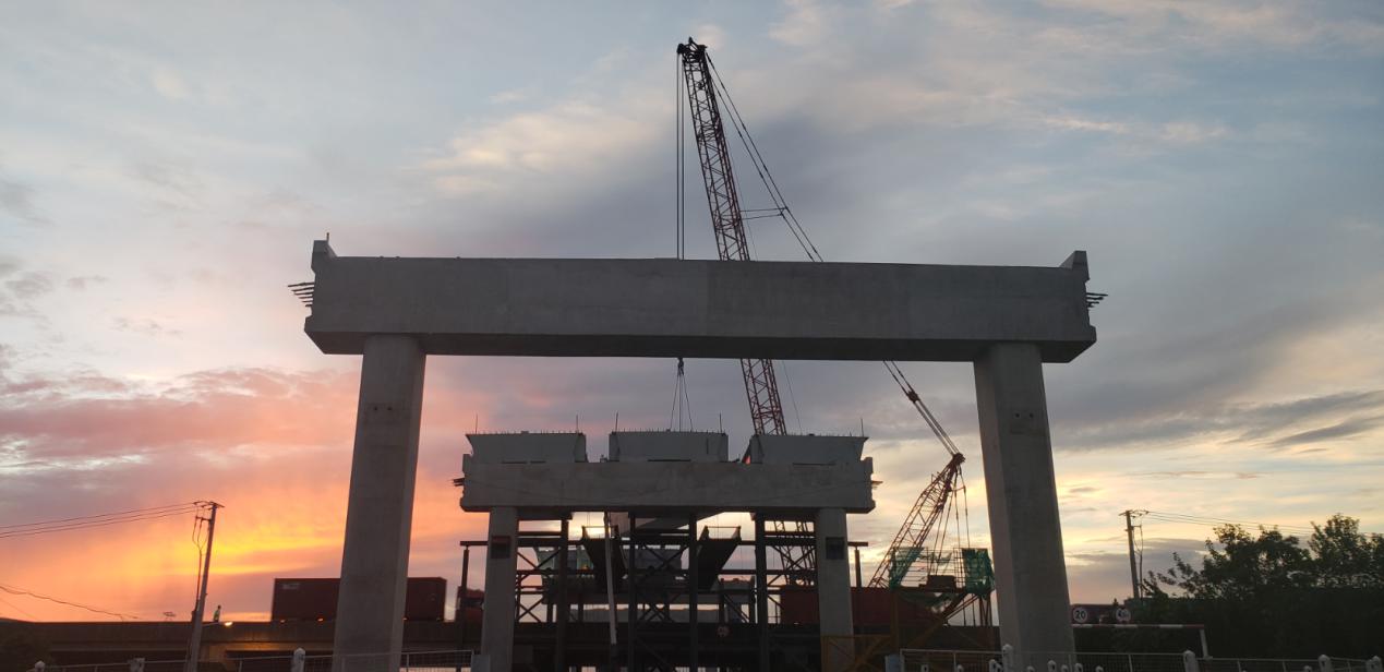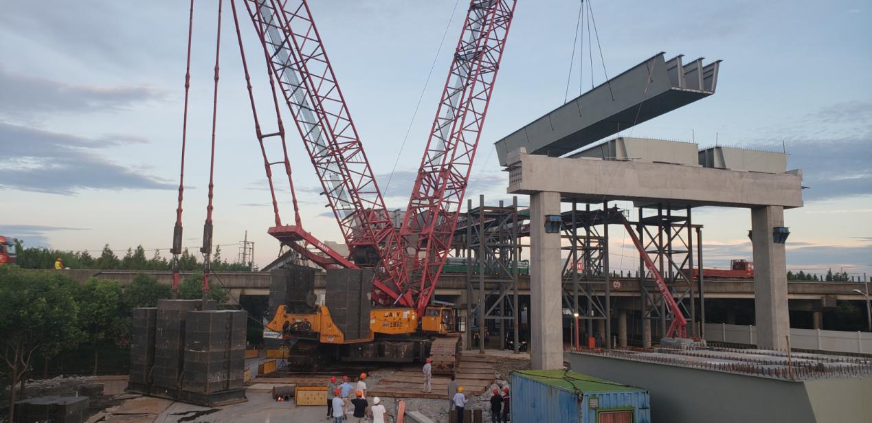 为确保主线高架的顺利推进,工程节点的按时完成,青发集团细部署、强落实、重协作,有序攻克关键技术节点。8月14日凌晨,三榀横跨G1503高速公路的钢混叠合梁采用两侧设置临时支架,以650吨履带吊超起状态进行吊装的方式全部架设完毕,为主线高架贯通打下了坚实的基础。截至目前,主线高架已完成75%,地面道路已完成32%。