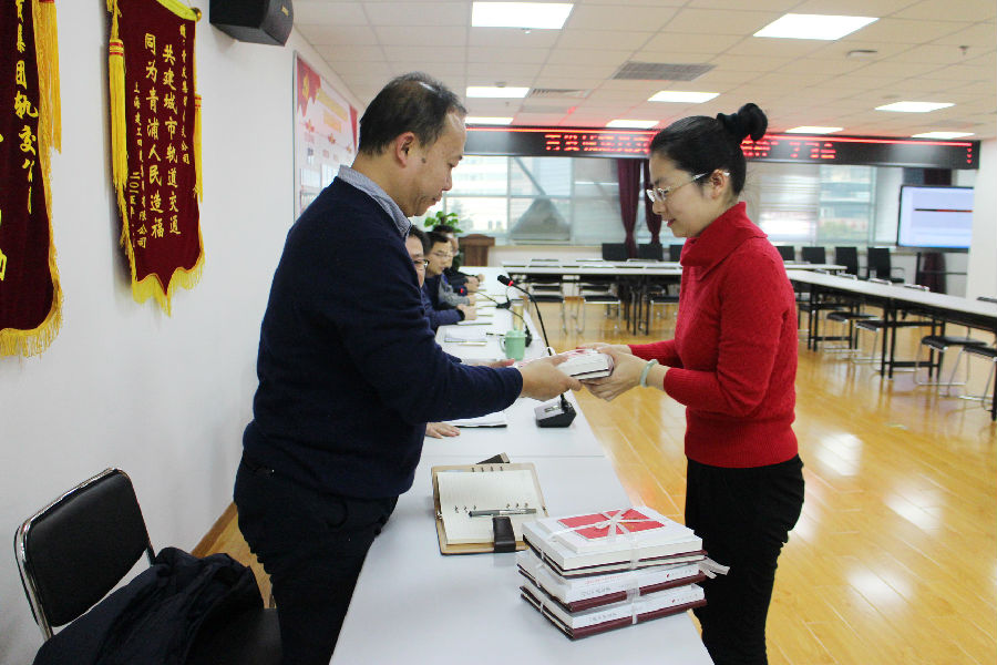 党支部书记潘莹莹、副书记马德良向在座的各位党员发放《中国共产党章程》、《中国共产党第十九次全国代表大会文件汇编》、《习近平讲故事》以及党员学习工作笔记。鼓励大家在在努力做好本职工作的同时,当好党员领头羊的角色,为青浦的城市建设奉上个人微薄力量。