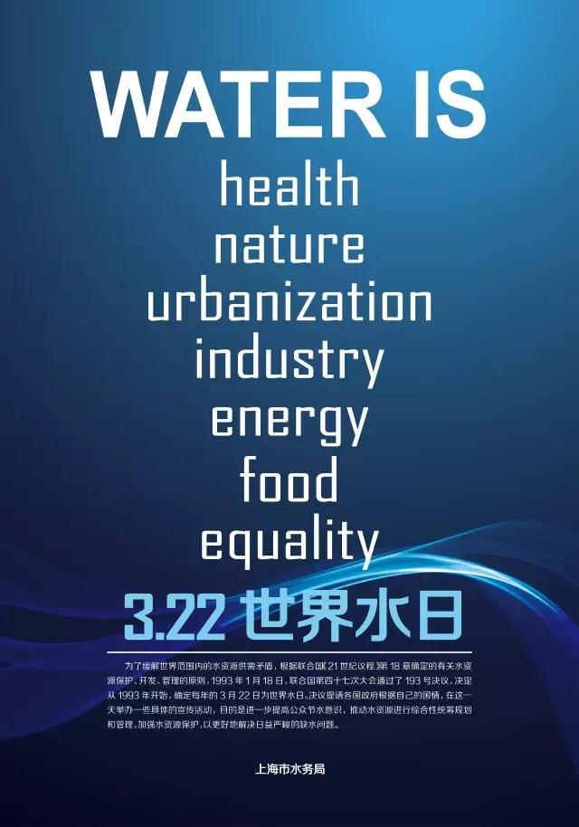 2017年3月22日是第二十五届“世界水日”,3月22日至3月27日是第三十届“中国水周“”,联合国确定2017年“世界水日”的宣传主题为“wastewater”(废水),我国纪念“世界水日”、“中国水周”活动的宣传主题为:“我的城市、我的河”,结合青浦实际,今年青浦纪念活动的宣传主题为“水美、青浦更美”。